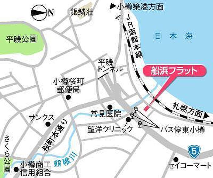 - JR函館本線 「 小樽築港駅 」 バス5分 「東小樽」停下車 徒歩1分