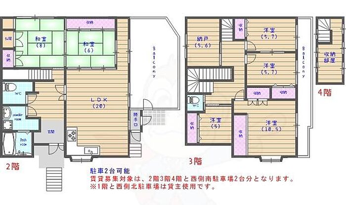 賃貸募集対象は、2階3階4階と西側南駐車場2台分となります。※1階と西側北駐車場は貸主使用です。