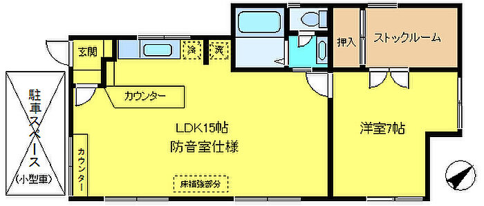 カースペース付きの1SLDK 防音使用LDK キッチンセット、浴室、トイレ、洗面台、フローリング新品