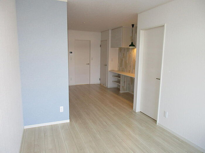13.7帖の広々LDK。カウンターの上下には収納棚。ちょっとした小物など置いて住む人の安らぎの場所にしてみても・・。お風呂は追焚き機能付きでぽかぽか。お料理は、腕前を存分に振る事の出来るW2250のシステムキッチンでバリエーション増加の見込大。