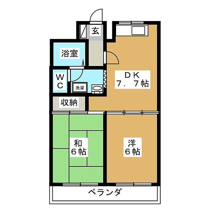 洋間・和室6帖の2DKの鉄筋コンクリート造のマンション。