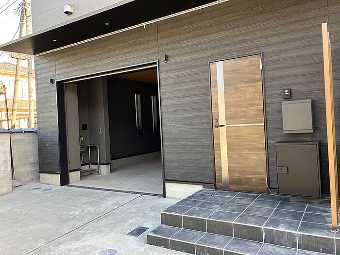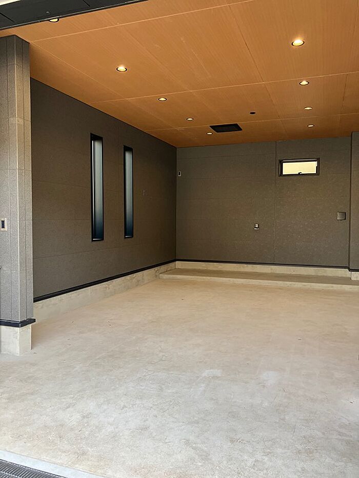 新築のガレージハウス付1LDK! 国道近く、買物環境充実! ガレージ内に収納棚もあり。