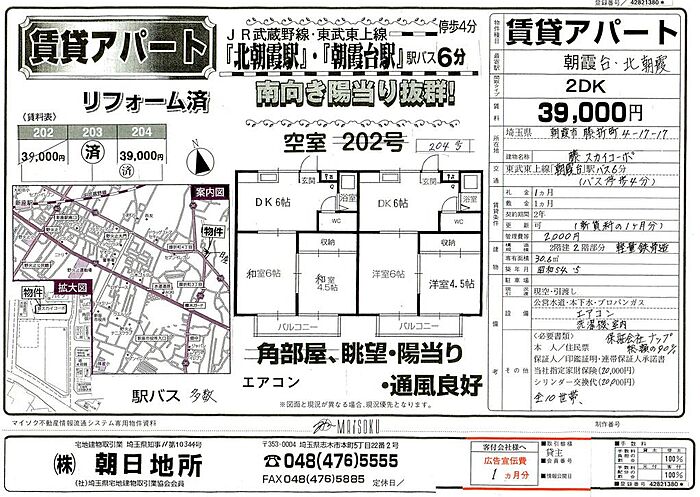朝霞市膝折町4−17−17 藤スカイコーポ204号室、陽当たり良好です、エアコン付き
