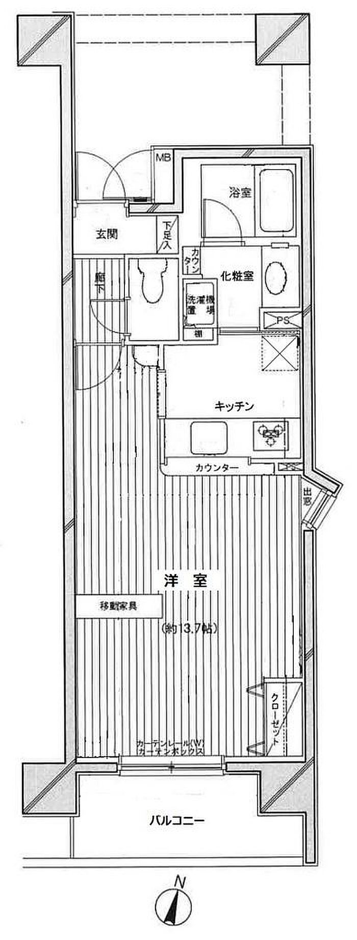 分譲賃貸マンション、南東向き、システムキッチン、3口ガスコンロ、カウンターキッチン、出窓、風呂追い焚き機能、広々1Kタイプ(洋室13.7帖)、移動家具付き ※タバコ不可(電子タバコ含む) ※ペット飼育不可 ※事務所、SHOHO不可、民泊不可