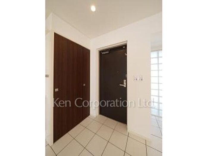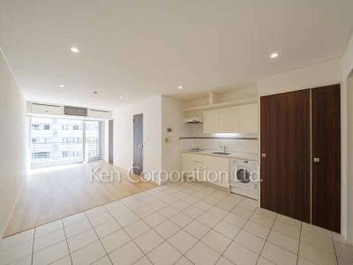 リビング白タイル貼り、洋室はバンブーフローリング、内廊下、真白い外観、ペット応相談。