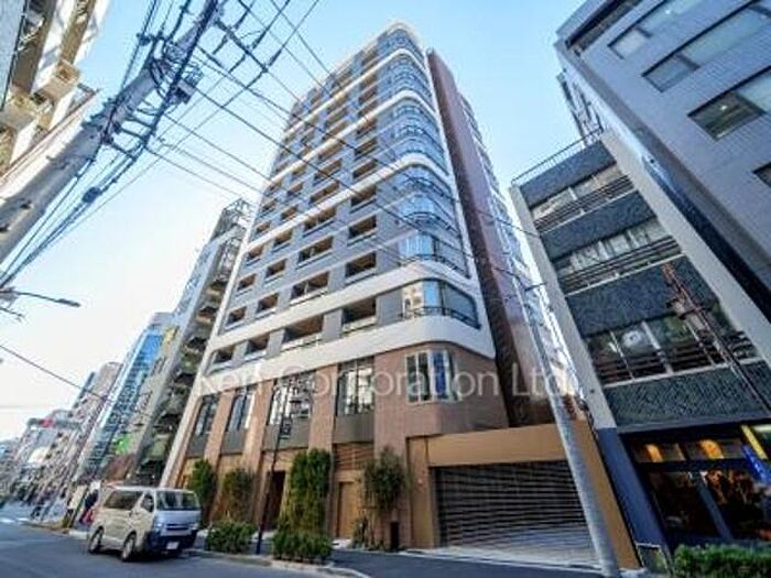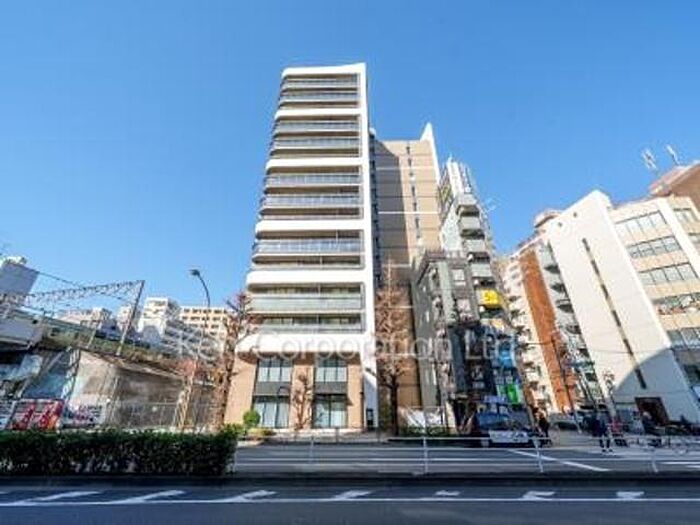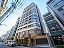 ダークグレーを基調にホワイトラインを組み合わせたモダンな外観に、レンガ調タイル張りが上質感を演出。曲線を描くファサードが特徴的で、都市の洗練と落ち着きを兼ね備えています。