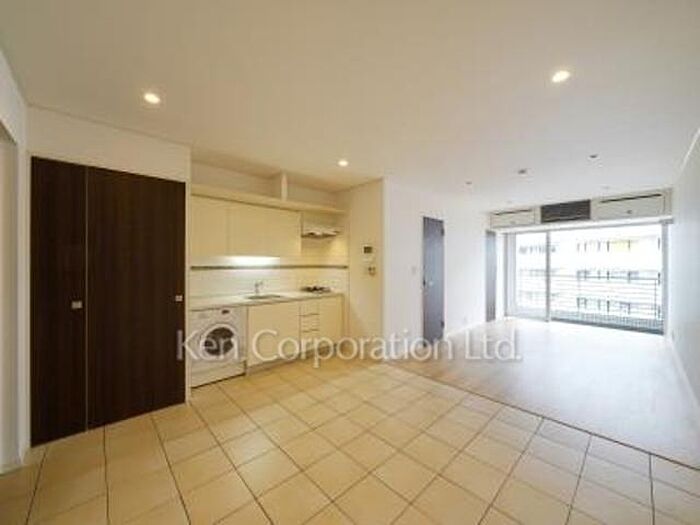 リビング白タイル貼り、洋室はバンブーフローリング、内廊下、真白い外観、ペット応相談。