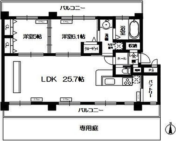 広々25.7帖のリビングと南北2面バルコニー庭付きでガーデニングに最適なお洒落な物件です!