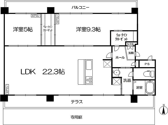 広々22.3帖のリビングと南北2面バルコニー、芝生庭付きでガーデニングに最適なお洒落な物件です!