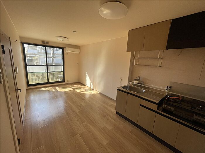 エアコン、TVインターホン、洗髪洗面化粧台、温水洗浄便座、居室照明、ガスコンロの設備付きと設備充実。全室角部屋タイプの間取りです。
