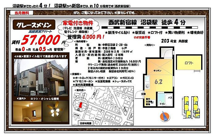 家電付物件( 電子レンジ 冷蔵庫 洗濯機 駅近買物便利 オートロック(モニター付き) 保証会社 外国籍相談