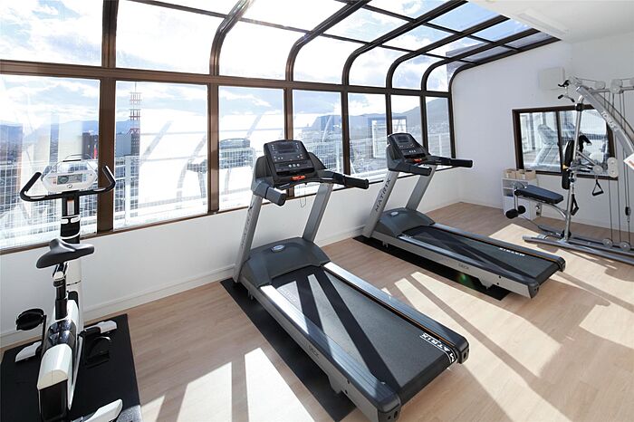 入居者専用ジム・大浴場・サウナ・Wi-Fi無料。1階にレストラン、コインランドリー(別途料金)あり。