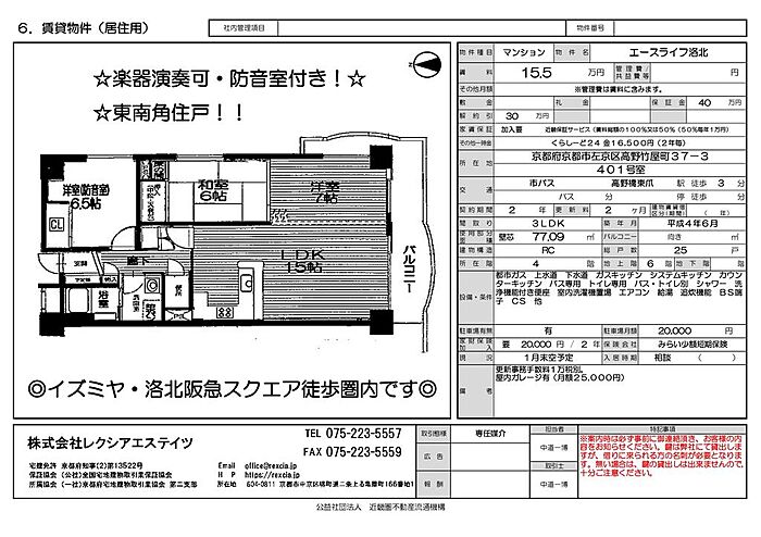 カナート洛北・イズミヤすぐそこ・防音室で楽器が演奏出来ます。ルーフバルコニー付