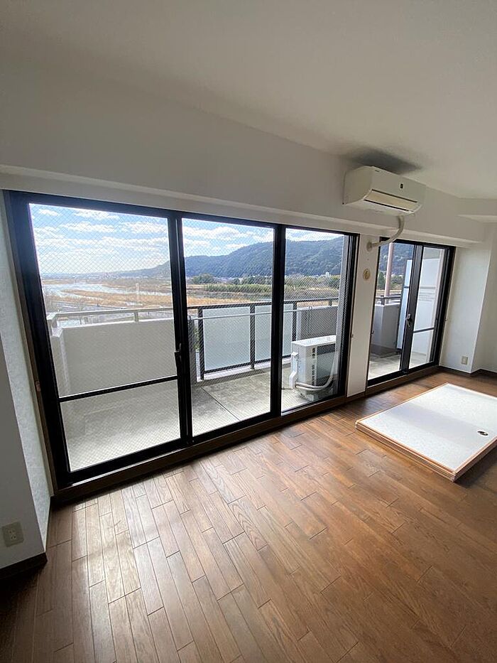 最上階角部屋の希分譲マンションです。リビングからは嵐山公園の緑と桂川の景色一望です。