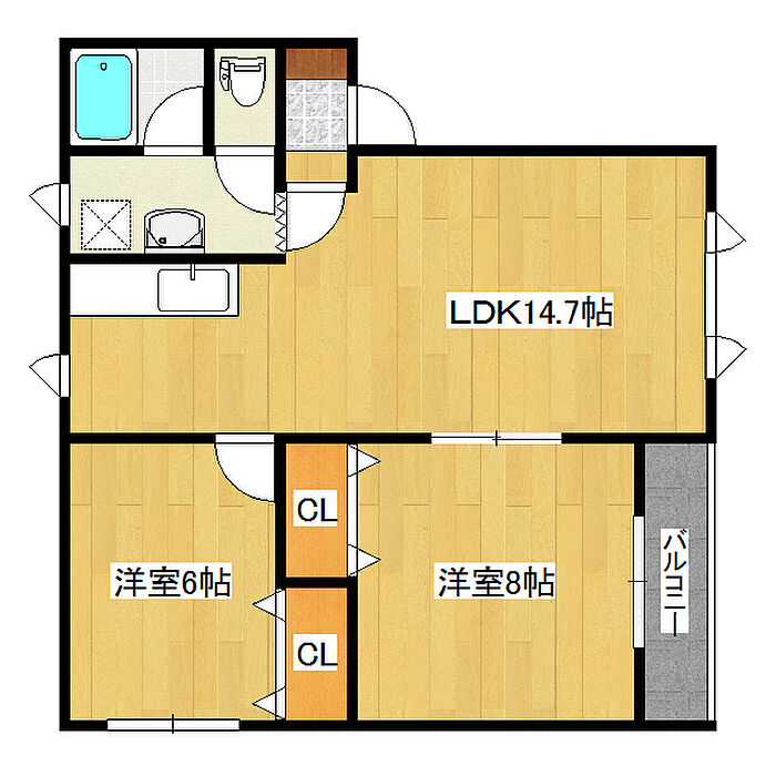 大型商業施設近くで買い物も外食も便利。エアコン・システムキッチン付きで快適生活。バルコニー付きの広々2LDKで、新生活が充実。※駐車場2台無料