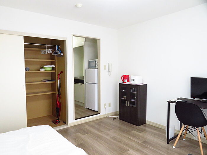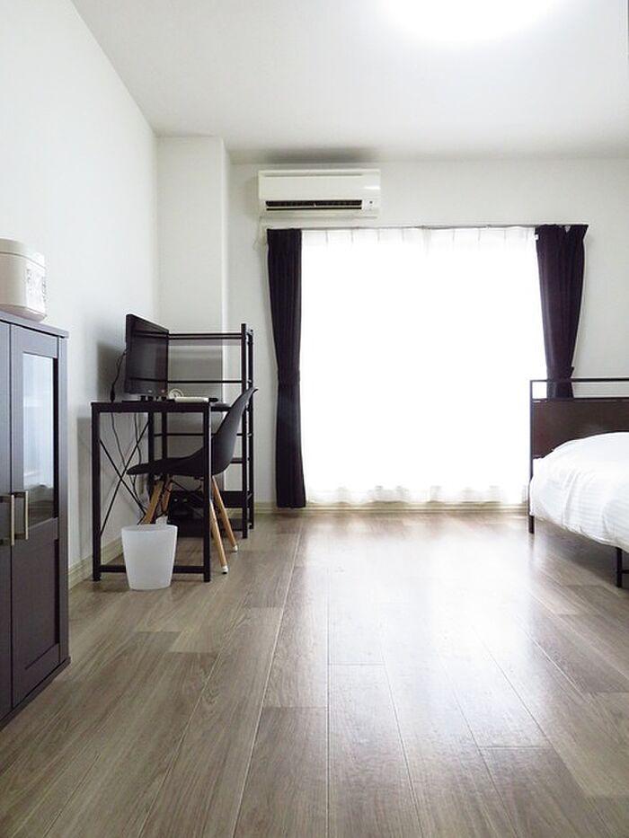 Wi-Fi対応の無料インターネット・保険料無料・水道代定額制(オール電化の為、ガス代不要)定期借家契約2年(再契約型、再契約時30、000円)家具家電付☆(ベッド・TV・テレビ台・ラック・冷蔵庫・椅子・洗濯機・炊飯器・掃除機・ドライヤー・カーテン・棚・電気ケトル・電子レンジ)