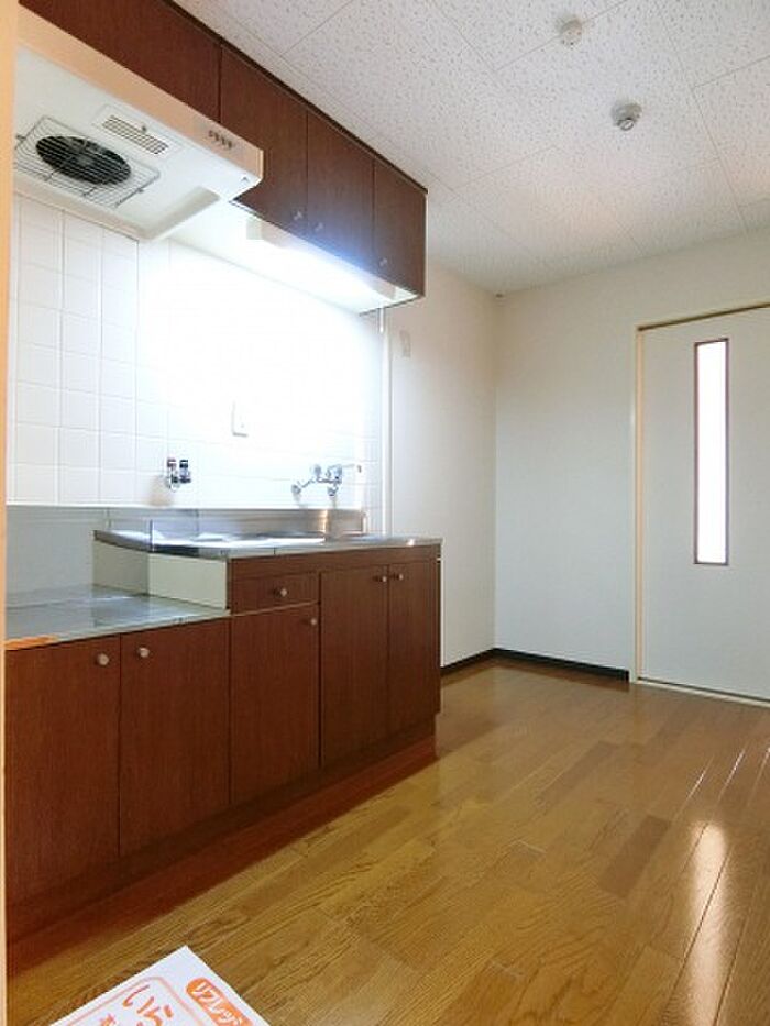 二口コンロ設置可です。浴室乾燥機も付いてますよ。