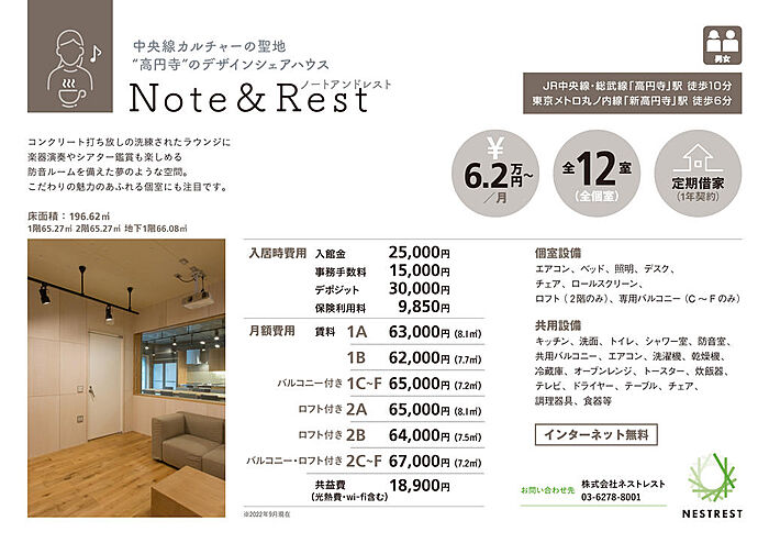中央線カルチャーの聖地「高円寺」のデザインシェアハウス。Wi-Fi、光熱費は管理費に含まれます。