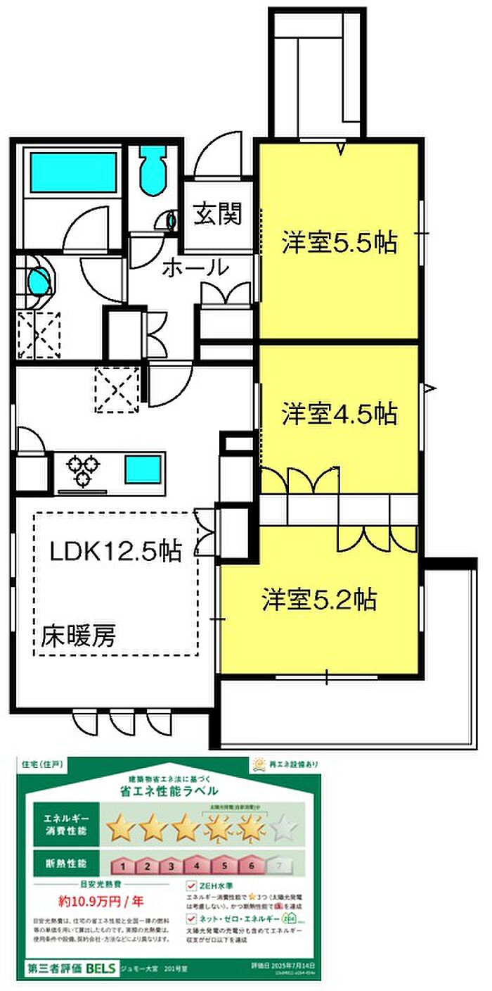 物件は本情報によらず現況が優先されます。※保険料はプランによって異なります。解約予告40日前。駐輪は各世帯2台まで。退去時専用部分清掃費借主負担。省エネルギー性能表示(BELS)におけるZEH−Mの評価取得物件(2025年7月14日に認証取得)。太陽光発電の電力を使用でき、電気代も節約。使用しなかった太陽光発電電力は、売電できるので売電収入も見込めます。電気はへーベル電気。