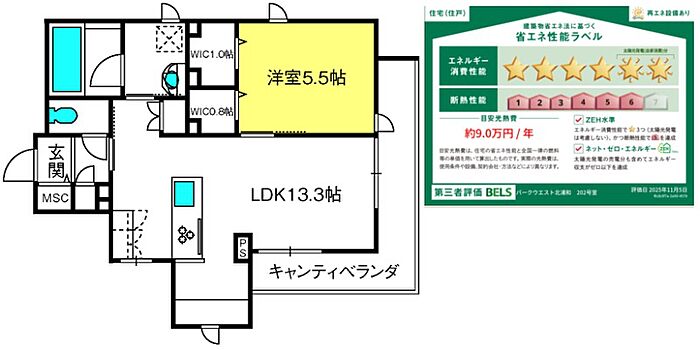 物件は本情報によらず現況が優先されます。※保険料はプランによって異なります。解約予告40日前。退去時専用部分清掃費借主負担。電気はへーベル電気。太陽光発電の電力を使用でき、電気代も節約。使用しなかった太陽光発電電力は、売電できるので売電収入も見込めます。省エネルギー性能表示(BELS)におけるZEH−Mの評価取得物件(2025年11月5日に認証取得)。