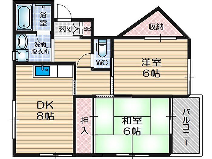 振分け間取りの2DK、脱衣所、独立洗面付です。