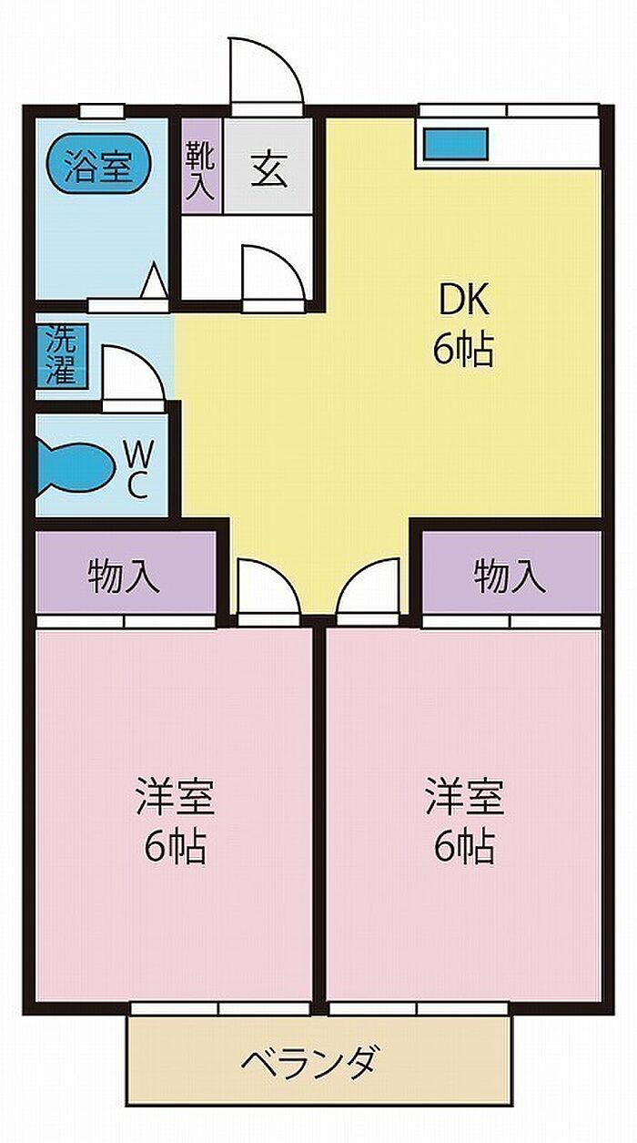 甲府市緑が丘の2DK、DK6帖、洋室6帖2部屋。