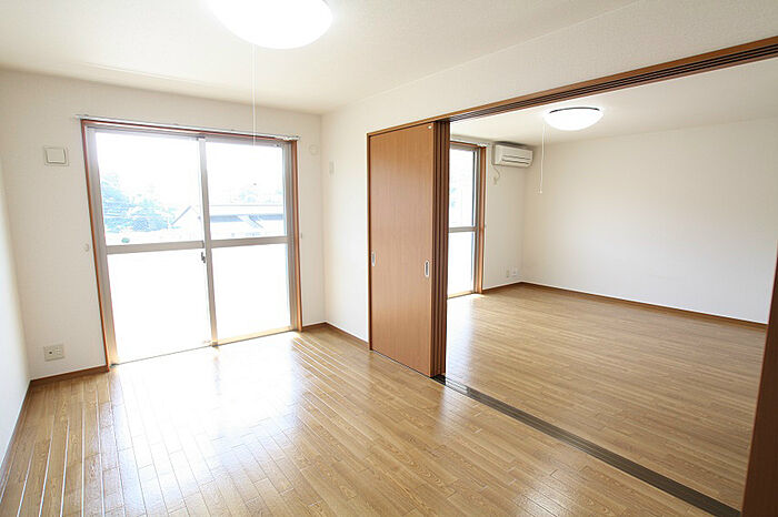 広々とした14帖のリビング、隣の洋室の扉が片側に寄せられますので、リビングとつなげてさらに広い空間に!キッチンは3口コンロの対面式、リビング側に収納棚もあり便利です。