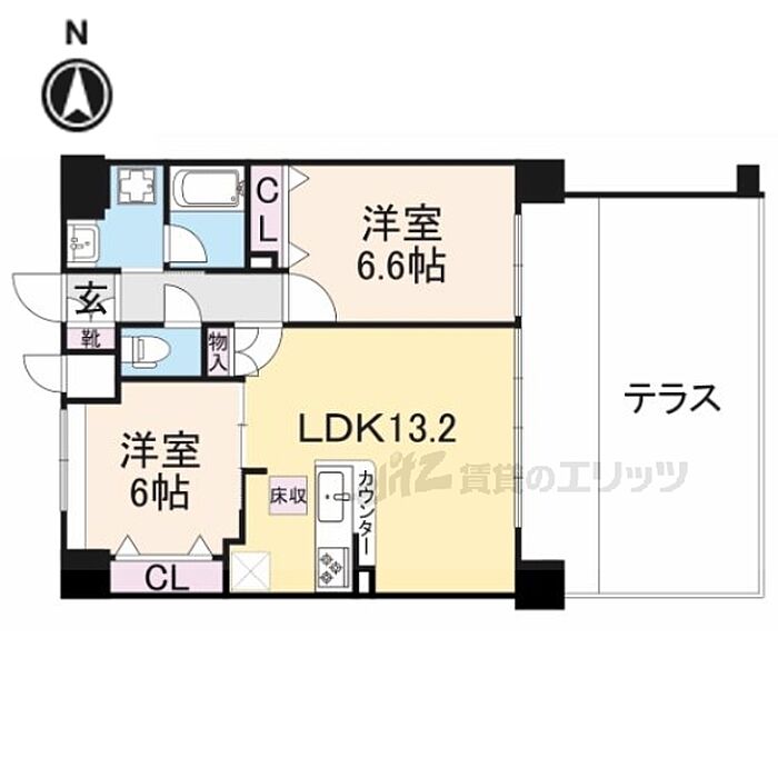 広いテラス付きです。カウンターキッチンや追い焚き機能が魅力的な2LDKです。TVドアホンで訪問者の顔を確認する事ができます。周辺にはスーパー・コンビニ・ドラッグストアがあり、お買い物にも困りません。