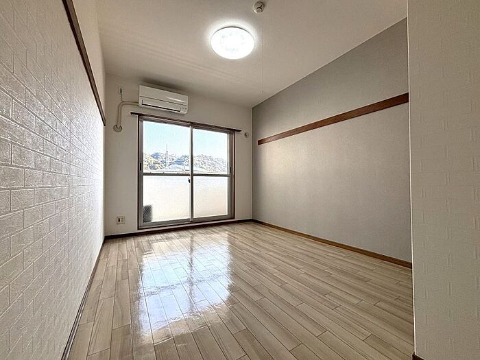 白を基調とした床に、水色のアクセントクロスが魅力的。普通車駐車可能。インターネット無料物件。