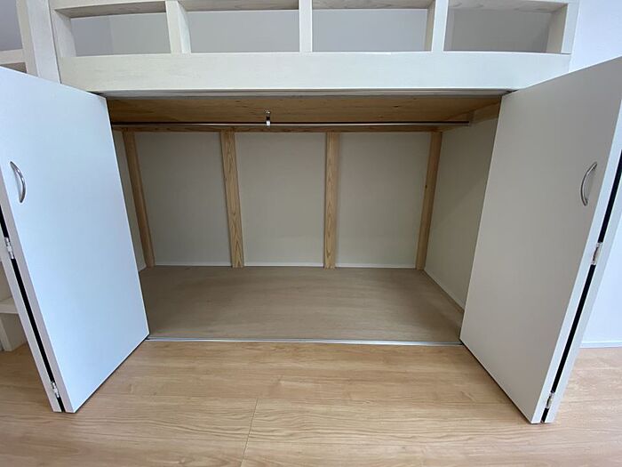 ベットスペースの下は大きな収納です。IHコンロ、冷暖房に洗面台、モニターインターホン等、設備充実です。