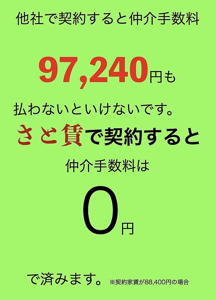 さと賃でご契約の方は契約時契約金無料キャンペーン実施中です。【前払賃料共益費】【初回保証料】【火災保険料】等の費用が全て無ryぅキャンペーン実施中です。お申し込みお手続きは来店不要のWEBによる電子申込み対応しています。home’s掲載以外の取扱物件多数あります。詳しくは公式ホームページまでお願いいたします。公式ホームページ:https://satochin.jp/その他気になるお部屋等ありましたら公式LINEまでメッセージ送ってください。公式LINE:https://lin.ee/YEcJE3mあなたのお部屋探し全力サポートいたします。