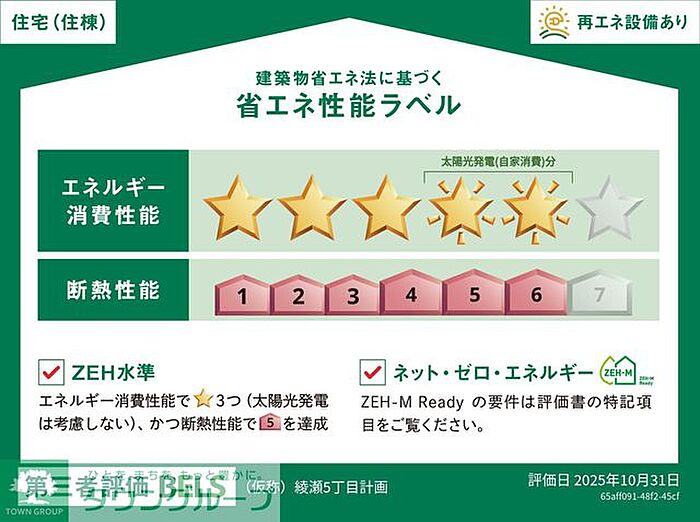 省エネ性能表示(BELS)におけるZEH-Mの評価取得物件(2025年10月31日に認証取得)ZEH-Mにお住まい頂くことで、高断熱による快適な暮らしと、省エネ設備による光熱費の削減が実現できます。