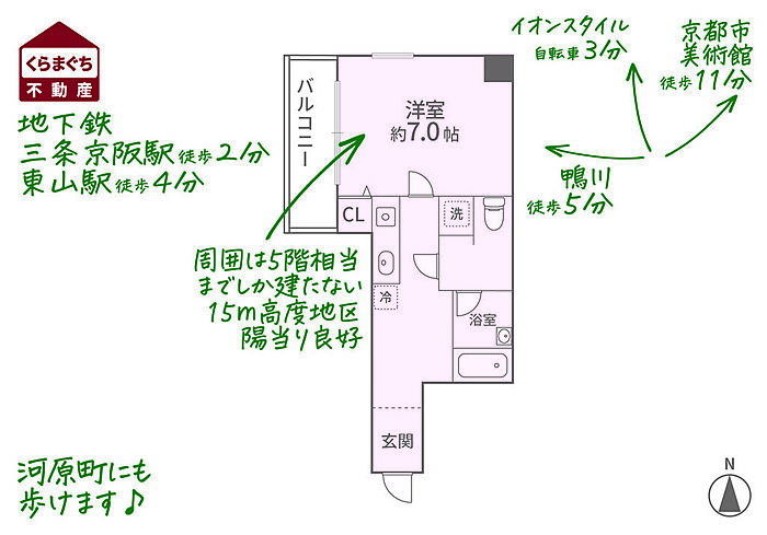 イオンスタイル東山二条が10月にオープンし利便性が高まる東山。6階角住戸、現在は15m高度地区(5階相当まで)のため陽当り良好。三条通と反対側住戸のため比較的閑静な環境。河原町も岡崎も歩ける穴場立地