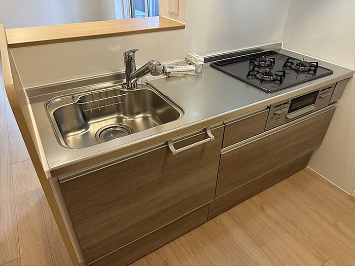 お部屋探しはメイキハウジングにお任せください☆3口ガスコンロ付きシステムキッチン。