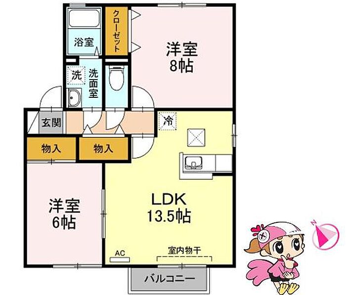 カウンターキッチンの2LDKです。雨の日の洗濯物も安心の室内物干し付きです。