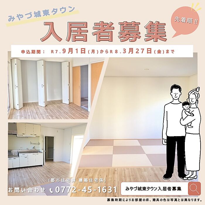2025年9月1日〜2026年3月27日の期間、先着順で入居者の募集を行います。ぜひご応募ください!!/入居者資格:40歳未満の方。単身者も可能。/公開抽選:募集戸数を超える応募者があった場合は、抽選となります。/入居時期:入居決定から約1か月後。ご希望に応じて順次入居可能です。/応募方法:必要書類添付のうえ、申込書を提出