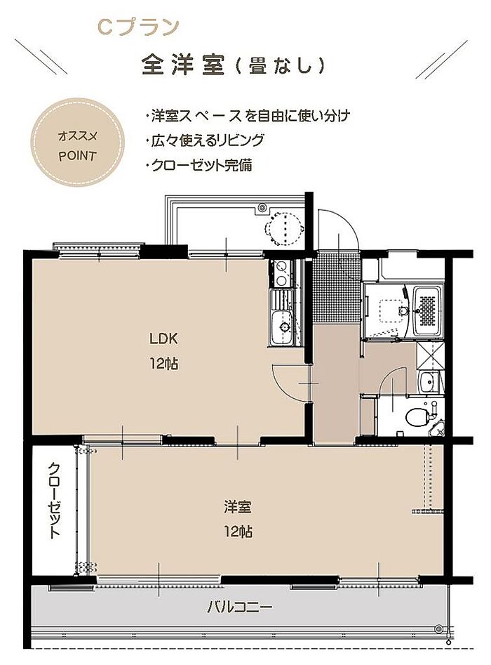 間取りを3DKから1LDKへ、リノベーション工事中です。(2026年2月完了予定)/水回り:ユニットバス・洗面台を更新。トイレには温水洗浄便座を新設。/設備:エアコン(LDKに1台)、IH調理器を新設。/収納:クローゼット、ハンガーラック収納を新設。/B101号室はプランC(すべて洋室)のお部屋です。