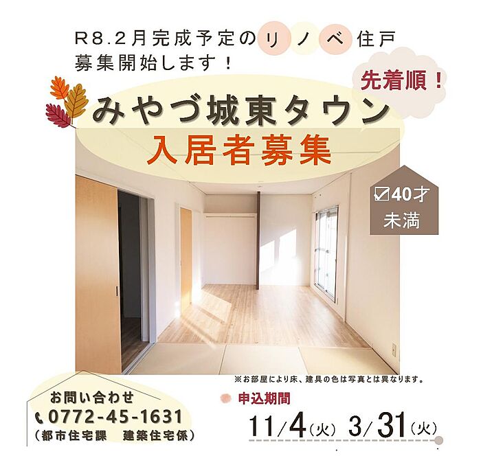 ★R8.2完成予定のリノベ住戸、先着順で募集受付中!ぜひご応募ください!!/募集期間:2025年11月4日〜2026年3月31日/入居者資格:40歳未満の方。単身者も可能。/入居時期:2026年3月上旬(予定)/応募方法:必要書類添付のうえ、申込書を提出。