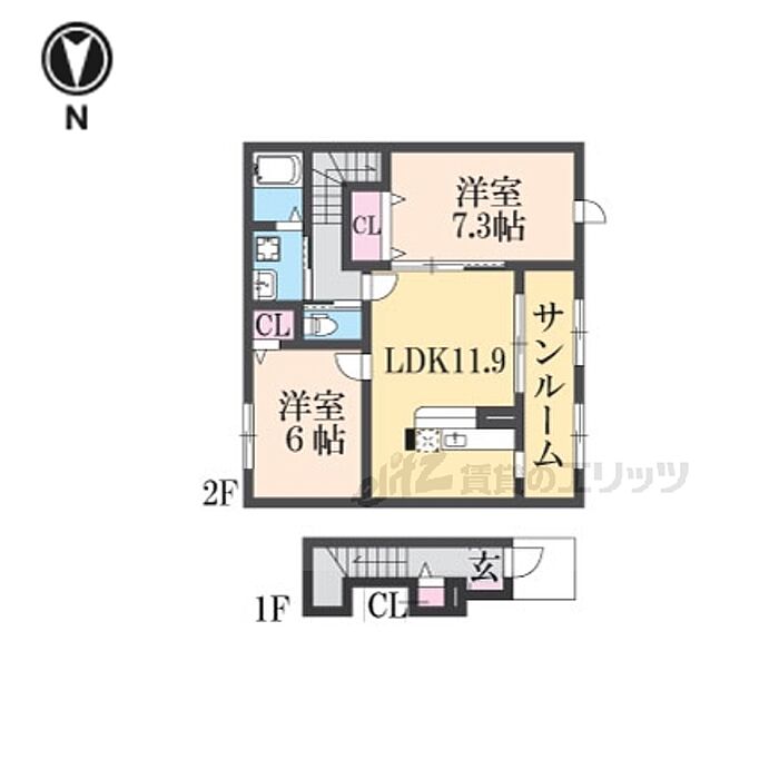 サンルーム付きの2LDK物件になります。洋室が7.3帖と広々としており、サンルームも3.5帖あるため洗濯物などの干し場所にも困りませんね。浴室乾燥機や温水洗浄便座などの設備が備わっております。・駐車場手数料(初回):5500円