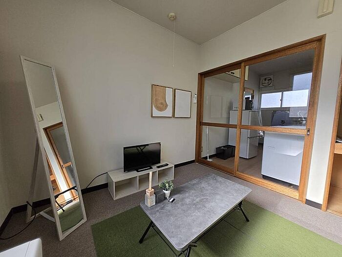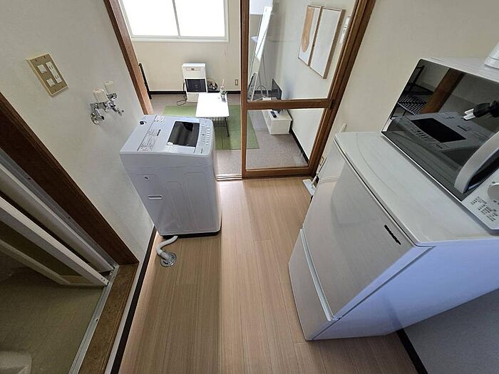 テレビ/テレビボード/電子レンジ/冷蔵庫/洗濯機/ガスコンロ/電気ケトル/テーブル/簡易ベッド/カーテン/洗濯物干し/ごみ箱/クイックルワイパー/ドライヤー/リモコン付照明/ストーブ/姿見/ブラインド/時計