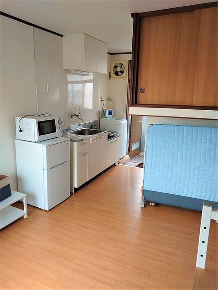 冷蔵庫・洗濯機・電子レンジ・TV・1口ガスIHコンロ・室内物干し・LEDシーリングライト・テレビ台・デスク・椅子・カラーBOX・棚・ベッド付き♪ネット無料・水道代共益費込みでお得♪火災保険料:18、000円/2年。短期解約違約金有り(1年未満は賃料3ヶ月分)。ペット飼育の場合、犬敷金10万円・猫敷金15万円、修負不要。退去時清掃費55000円。鍵交換(18700円)任意。契約時前家賃あり