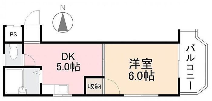 お部屋は1DK(DK5帖洋室6帖)の間取りで、ガス2口コンロ付きのキッチンがあり、自炊派の方にもおす