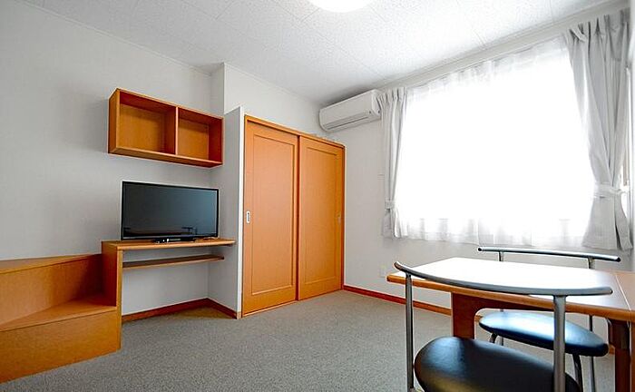 高松市川島東町の1Kアパートです 家具・家電付き(テレビ・エアコン・冷蔵庫・洗濯機・電子レンジ・照明・テーブル・椅子・造付けベッド・カーテン)のお部屋です雨の日に嬉しい浴室乾燥機・来客時に安心なTVモニターホン付き