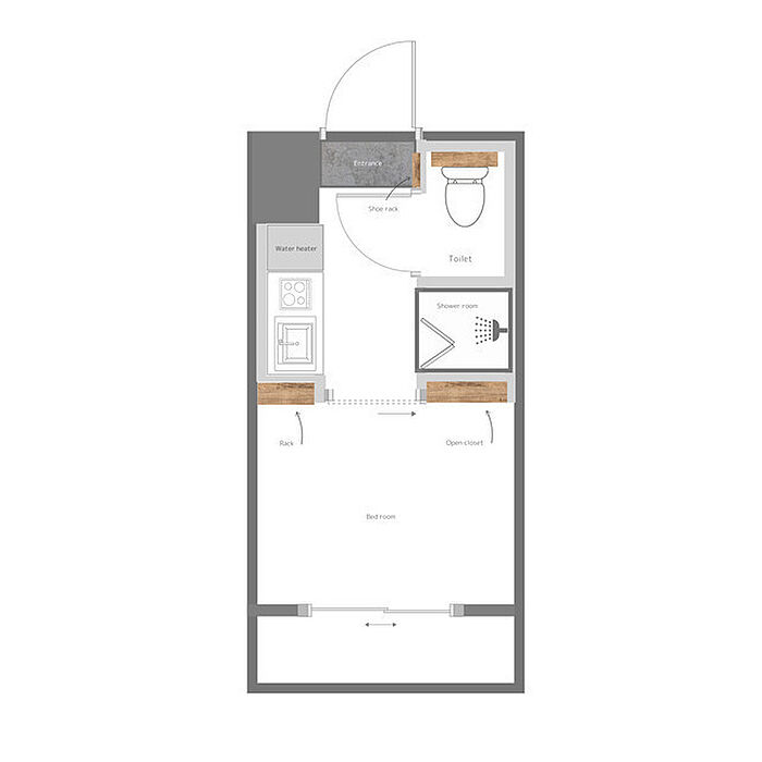 2025年5月完成。シャワールーム・トイレセパレートタイプ。居室には可動棚とハンガーラック付き。棚を動かして冷蔵庫を置くことも可能です。