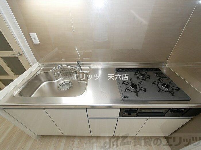 コンロ三口あり。調理の時間短縮ができて大変便利です。