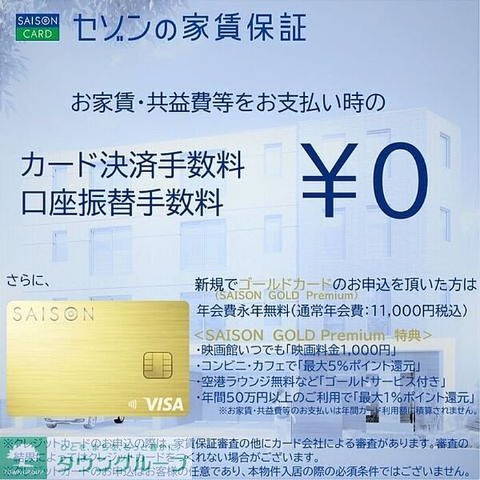 保証会社利用料:0.50ヶ月 クレディセゾン:初回月額総額の50%、次年度以降10、000円/年 口座振替手数料0円ジェイリース :初回月額総額の50%、次年度以降10、000円/年 口座振替手数料500円(非課税…