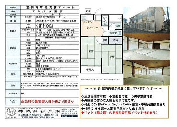 ペット相談可(猫可)コンビニ・病院も近く、付近にららぽーと湘南平塚がありお買物も楽しめます☆