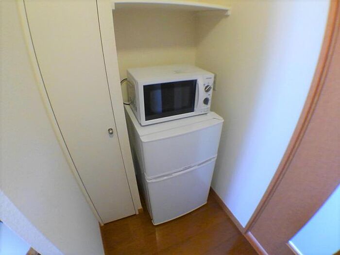 高松市飯田町の1Kアパートです 家具・家電付き(テレビ・エアコン・冷蔵庫・洗濯機・電子レンジ・照明・テーブル・椅子・カーテン)のお部屋です雨の日に嬉しい浴室乾燥機付き宅配BOX設置で留守時の受け取りも可能