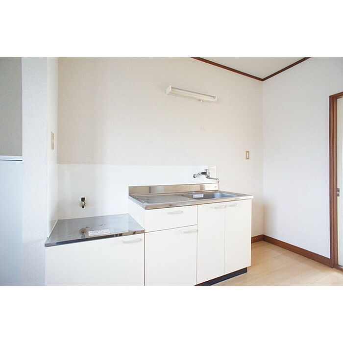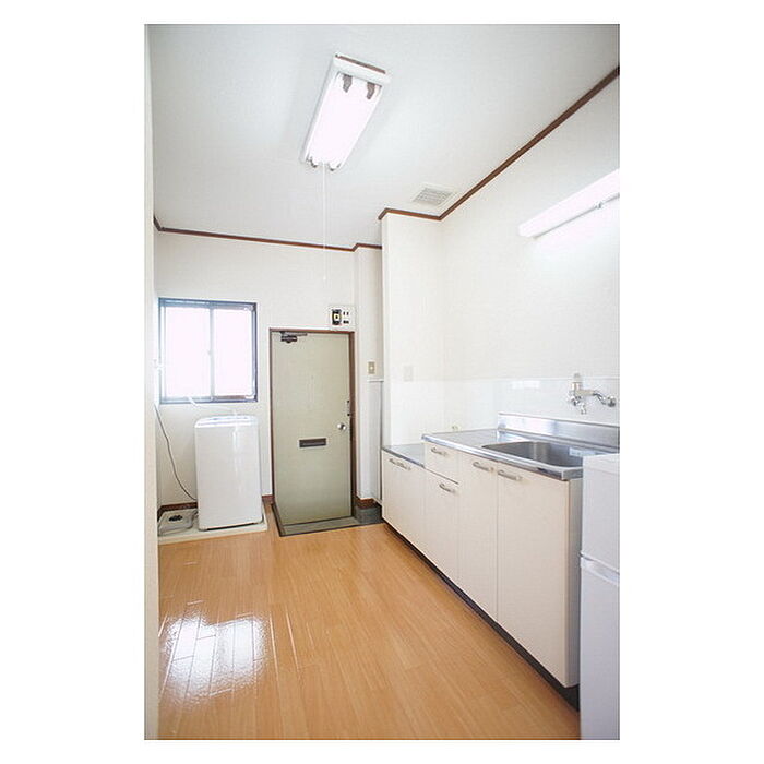 茨城大学150m 家電(冷蔵庫・洗濯機・照明器具)8帖の洋室は広さを感じるスペース。1帖分の収納もしっかり活用いただけます。キッチンも家電配置をイメージしやすい空間。