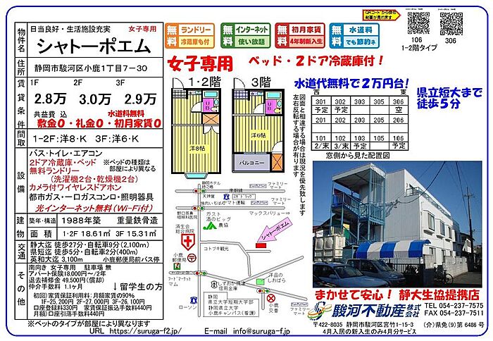 女子学生専用 無料ランドリー有(洗濯機・乾燥機) 商店街や総合病院、スーパー・コンビニ近くに有り